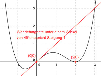 Aufgabe 81 Der Graph einer ganzrationalen Funktion 4. Grades berührt im Punkt (2|0) die x-Achse, hat im Punkt (0|0) einen Wendepunkt, und die Wendetangente schneidet die x-Achse unter einem Winkel von 45°. Wie lautet seine Funktionsgleichung?