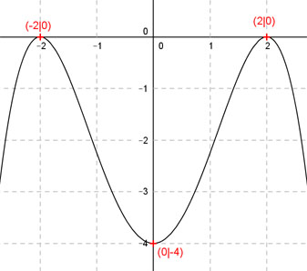 Aufgabe 83 Der Graph einer achsensymmetrischen ganzrationalen Funktion 4. Grades hat in (0|-4) einen Tiefpunkt und berührt die x-Achse bei 2 und -2. Wie lautet seine Funktionsgleichung?
