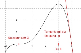 Aufgabe 87 Der Graph einer ganzrationalen Funktion 4. Grades hat im Wendepunkt (0|0) und an der Stelle x = 6 waagerechte Tangenten und schneidet die x-Achse an einer weiteren Stelle mit der Steigung -8. Wie lautet seine Funktionsgleichung?