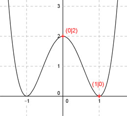 Aufgabe 97 Der Graph einer achsensymmetrischen ganzrationalen Funktion 4. Grades geht durch den Punkt (0|2) und hat in (1|0) einen Tiefpunkt. Wie lautet seine Funktionsgleichung?