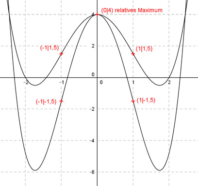 Aufgabe 99 Der Graph einer achsensymmetrischen ganzrationalen Funktion 4. Grades hat Wendepunkte, die jeweils eine Einheit von der y-Achse und 1,5 Einheiten von der x-Achse entfernt liegen und ein relatives Maximum im Punkt (0|4). Wie lautet seine Funktionsgleichung?