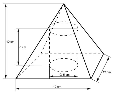 Aufgabe 208 Aus einem Kegel mit einem Grundkreisradius r = 4,9 cm und einer Höhe h von 13,2 cm soll die größte quadratische Pyramide gleicher Höhe gefertigt werden. Wie groß ist der Abfall A?