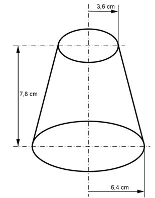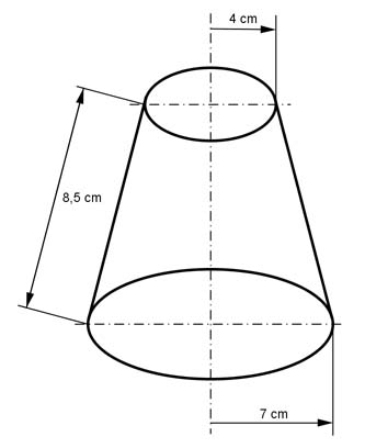 Aufgabe 258 Wie groß sind die Höhe h und der Mantel M eines geraden Kegelstumpfes, wenn der kleinere Radius 8 cm, der größere 12 cm und sein Volumen 10 l betragen?