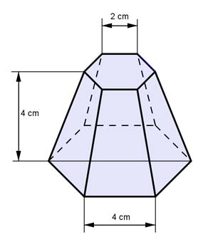 Aufgabe 254 Wie groß sind das Volumen V und die Oberfläche O des Pyramidenstumpfes mit regelmäßigen Sechsecken als Grund- und Deckfläche, deren Mittelpunkte senkrecht übereinander liegen?
