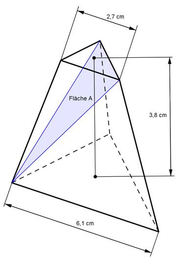 Aufgabe 265 Die Schnittfläche A unterteilt den regelmäßigen dreiseitigen Pyramidenstumpf in 2 Teilkörper. Wie groß sind die Schnitt-fläche A und das Volumen V des kleineren Teilkörpers?