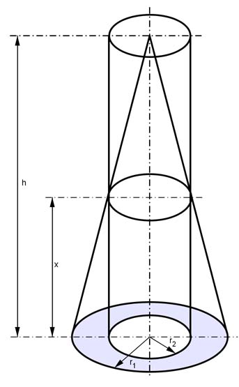Aufgabe 266 Wie groß ist a) x, wenn r1, r2 und h bekannt sind. b) r2, wenn x, r1 und h bekannt sind c) x, wenn r1 : r2 und h bekannt sind d) x, wenn die blaue Kreisringfläche so groß wie die Grundfläche des Zylinders ist und h bekannt ist e) x, wenn der unter der gemeinsamen Schnittfläche liegende Zylinder das gleiche Volumen wie der darüberliegende Kegel hat und h bekannt ist f) x, wenn der über der gemeinsamen Schnittfläche liegende Kegel das gleiche Volumen wie der darunter liegende Kegelstumpf minus Zylinder hat und r1, r2 und h bekannt sind?
